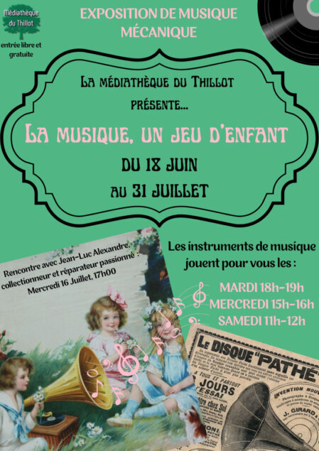 Des pièces rarissimes en provenance de la collection privée de Jean-Luc Alexandre, un membre de la famille de Maïté, animatrice de la médiathèque. « Je n’ai pas eu trop de mal à le convaincre d’exposer quelques-unes de ses pièces » sourit-elle « Il est toujours partant lorsqu’il s’agit de mettre ce patrimoine en valeur ». Et ce n’est qu’une partie de sa collection « Qui a débuté il y a au moins 30 ans, par le plus grand des hasards : une crevaison à vélo alors qu’il se trouvait à proximité de l’antiquaire de Tendon. Il y a vu un phonographe auquel il s’est intéressé, qu’il a acheté et qu’il a réparé ». Depuis, la passion s’est développée et comporte de très nombreuses pièces « Toutes en état de marche » commente Maïté. L’ensemble, pour beaucoup orienté vers les enfants, constitue une façon pour la médiathèque de célébrer la Fête de la Musique.