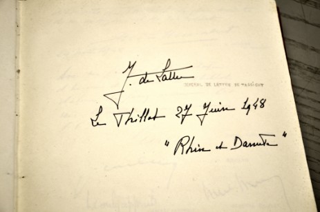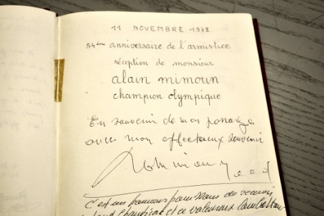 Ouvert le 27 juin 1948 à l’occasion de la remise de la Croix de Guerre à la commune, il porte la signature du général de Lattre de Tassigny (qui ne sera nommé Maréchal de France à titre posthume qu’après son décès en janvier 1952). Le 26 novembre 1954, à l’occasion de l’inauguration de la place De Lattre de Tassigny, c’est donc son épouse qui paraphe le Livre d’Or. De nombreuses pages relatent des cérémonies patriotiques auxquelles ont assisté de nombreuses personnalités, comme le 50ème anniversaire de la Libération fêté le 27 novembre 1994 en présence d’anciens du Corps Franc Pommiès ou encore la remise de la Légion d’Honneur à Mme Paulette Daniel le 8 mai 1990. Le précieux témoin de l’histoire de la commune porte également la trace de nombreux autres événements. Chronologiquement, le premier d’entre eux est l’inauguration du nouvel Hôtel de Ville le 13 novembre 1957, suivie de celle concernant l’école maternelle du centre le 8 septembre 1962. Une page est consacrée à la visite de Mgr Vilnet en date du 24 avril 1966. Le 11 novembre 1972, c’est à Alain Mimoun, le champion olympique du marathon en 1956 à Melbourne qu’est tendu le stylo afin de parapher le précieux livre, à l’occasion de la commémoration de l’anniversaire de l’armistice de 1918. Il y est invité en qualité de libérateur ayant participé à plusieurs campagnes, dont la bataille du Mont Cassin en janvier 1944, à laquelle il est gravement blessé et évite de peu de se faire amputer de la jambe gauche. Plus tard, en 1973, une page est consacrée aux « huiles » présentes au coup d’envoi des travaux de la piscine de Chaume qui verra une autre page consacrée à son inauguration le 13 janvier 1975. L’année suivante, une page illustrée de photos témoigne de la visite de Michel Poniatowki, alors ministre de l’intérieur à l’équipe dirigée par Raymond Grégoire. L’inauguration du camping municipal le 19 juillet 1982, puis celle de la salle omnisport le 13 janvier 2001 complètent ce Livre d’Or dans lequel il reste de nombreuses pages vierges, prêtes à recevoir les témoignages de personnalités marquant une date importante de la vie de la cité.